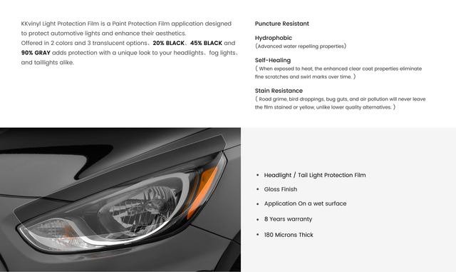 Headlight PPF 20% Sort, 30cm x 15m Rull, levetid garanti 8 år, 7mil (180 Microns), påføring med vann.